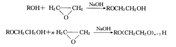• 一般情況下,反應是將NaOH配成50%左右的水溶液,加入醇中,催化劑用量為脂肪醇的0.1%~0.5%(質量分數(shù)),真空下脫水,在溫度為135~140℃、壓力為0.1~0.2 MPa下與環(huán)氧乙烷反應,環(huán)氧乙烷加入量由制取聚合物的相對分子質量決定。